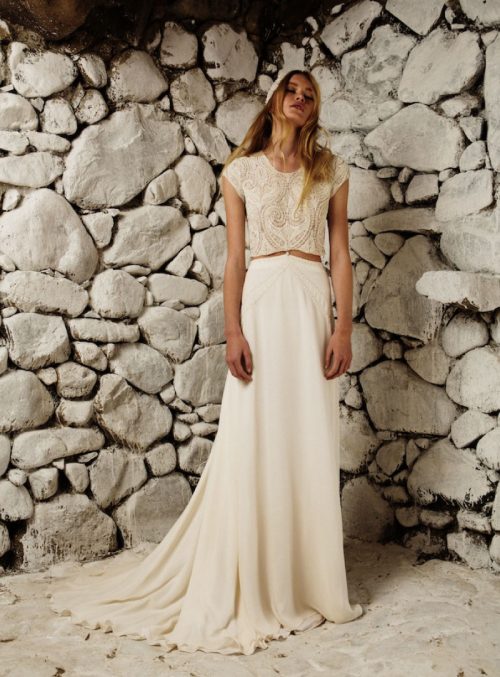 The skirt is attached to the top with a button detailing and is complimented by a soft beading around the waistline and down the sides of the hips on layers of silk chiffon.