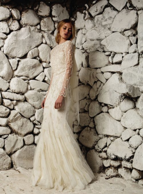 The breathtaking “Parisienne” gown consists of layers of silk-chiffon and is adorned onto a soft tulle and is completely hand-beaded with an intricate design of stones and pearls. The fitted low-back gown with sheer sleeves is a showstopper piece.